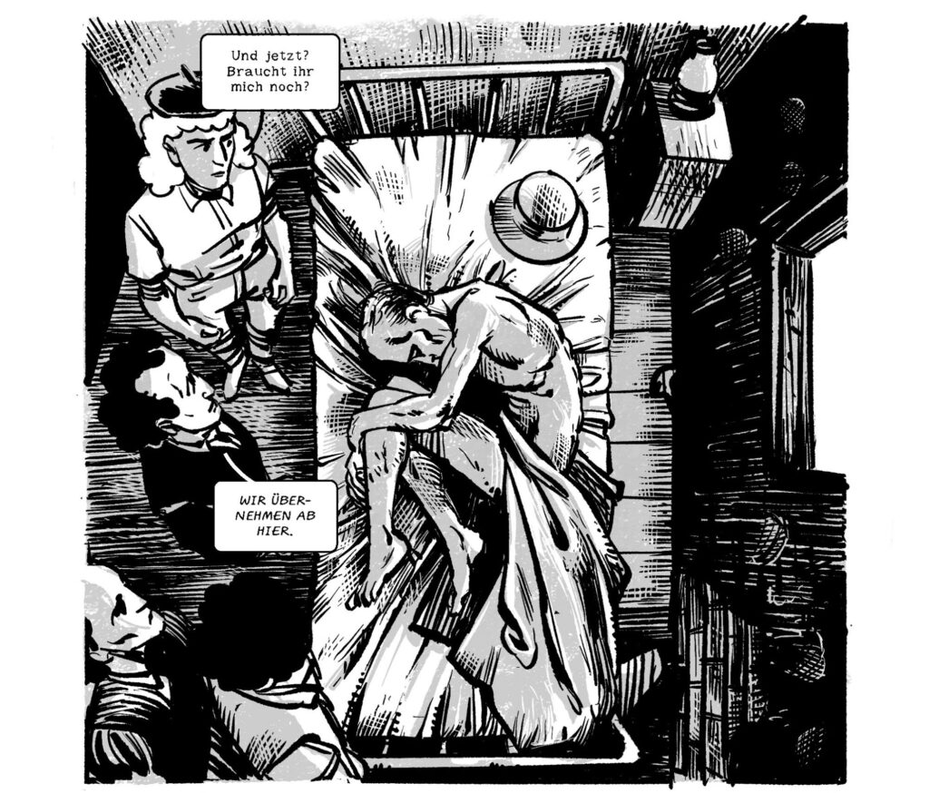 Ich erzähle nicht nach, was bekannt ist. Stattdessen habe ich mich an die blinden Flecken in seiner Biografie und in meinem Wissen geheftet, weil sie mich interessieren – und weil ich sie dann mit Fiktion ausfüllen kann. Was Beuys mit dem Kojoten (mit dem er sich im Rahmen einer Performance mehrere Tage in einer New Yorker Galerie einsperrte; Anm.) redete, weiß niemand. Ebenso wenig, was er auf den Autofahrten zwischen Wahlkampfterminen für die Grünen redete. Am Anfang dachte ich auch ausgiebig darüber nach, wie viele von diesen ikonischen Bildern, die Beuys produziert hatte, ich nutzen sollte. Letztlich streute ich sie strategisch und rar. Ich wollte mir den Raum lassen, ausgehend von wenigen Impulsen eigene Bilder zu entwickeln. Zu Beginn des Buches kommt zum Beispiel Beuys’ Hand aus einem Filzberg heraus. Das ist einerseits ein generisches Bild, hat etwas von Wiedergeburt, Auferstehen, auch von einer Tathand. Andererseits waren Hände für Beuys einfach sehr wichtig. In vielen Interviews sieht man seine Hände; er macht ständig etwas. Als Bildhauer ist die Hand die Erweiterung des Auges. Im Entstehungsprozess haben sich bei mir noch viele weitere Bilder eingeschlichen und entwickelt, die ich immer wieder zitiere – auch selbstreferenziert aus meiner eigenen Arbeit heraus, oder aus anderen Comics: Wenn Beuys seinen Zusammenbruch erlebt und man von oben auf ihn blickt, ist das ein direktes Zitat aus »Born Again« von Frank Miller und David Mazzucchelli. Das war – noch vor »Dark Knight« – einer der wichtigsten Mainstreamcomics, weil er einen Superhelden auf etwas Menschliches reduzierte.